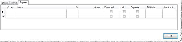 · %: Defaults to 100% for the first payee entered. By changing the percentage, the amount going to the first party is reduced. This allows you to assign the remaining balance to other parties.