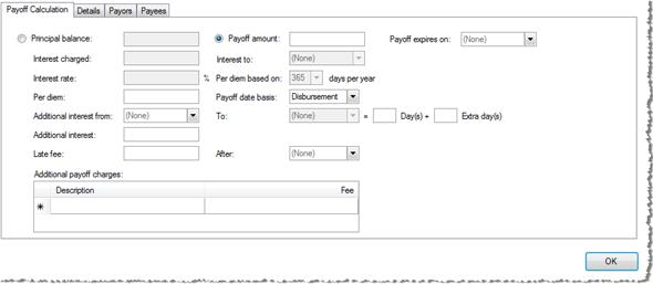 · Payoff amount: This amount usually includes the principal balance and interest. Principal balance, Interest charged, Interest to, Interest rate, and Per diem based on fields will be disabled when Payoff amount is selected.