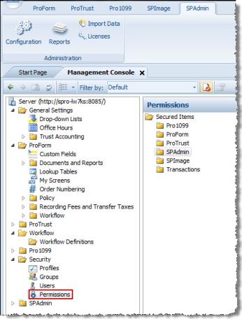 The Permissions section of SPAdmin assigns user rights (permissions) to administer various actions within the system.