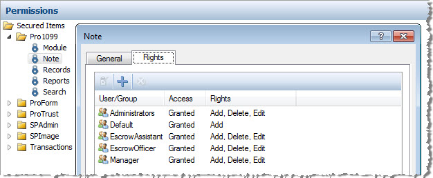 - In the Permissions window, click on the folder and node under Secured Items from which you would like to remove a user or group. This brings up the properties dialog of the permission node selected.