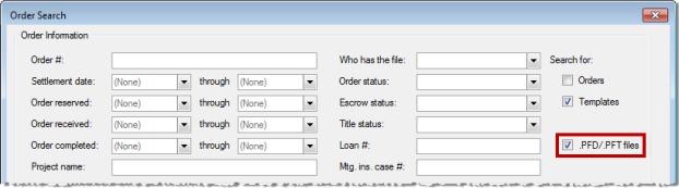 - Users can search for .PFD/.PFT files to overlay. Input the desired filter data into the Order Search dialog, check the .PFD/.PFT files checkbox, and click Search to locate an order to overlay.