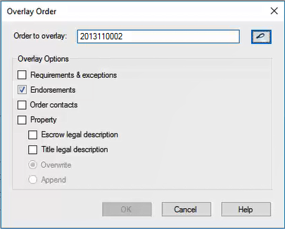 Users can select from a list of endorsements and overlay them into an order. From an open order, press the Overlay Order button on the ribbon. Enter or search for an order to overlay.