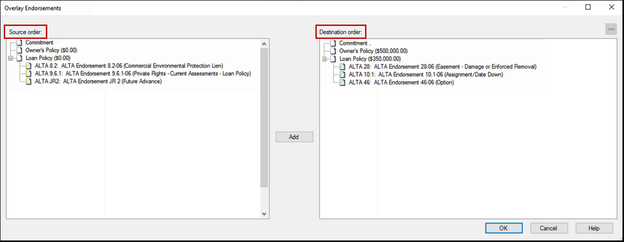 Check the Endorsements check box to open the Overlay Endorsements window. This window shows the list of endorsements available in the Order to overlay (Source Order) and endorsements already in the existing order (Destination order).