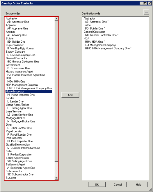 These list views contain order contact types, codes and names. All Order contacts are available for overlay. In addition to drag and drop ability, the Overlay Order Contacts dialog includes an Add button. To add a contact, select it in the Source order and then click Add. This adds the selection as a new contact on the Destination order. To delete a contact in the Destination order, select it in the Destination order, then either use the keyboard Delete key or right-click and select the remove option.